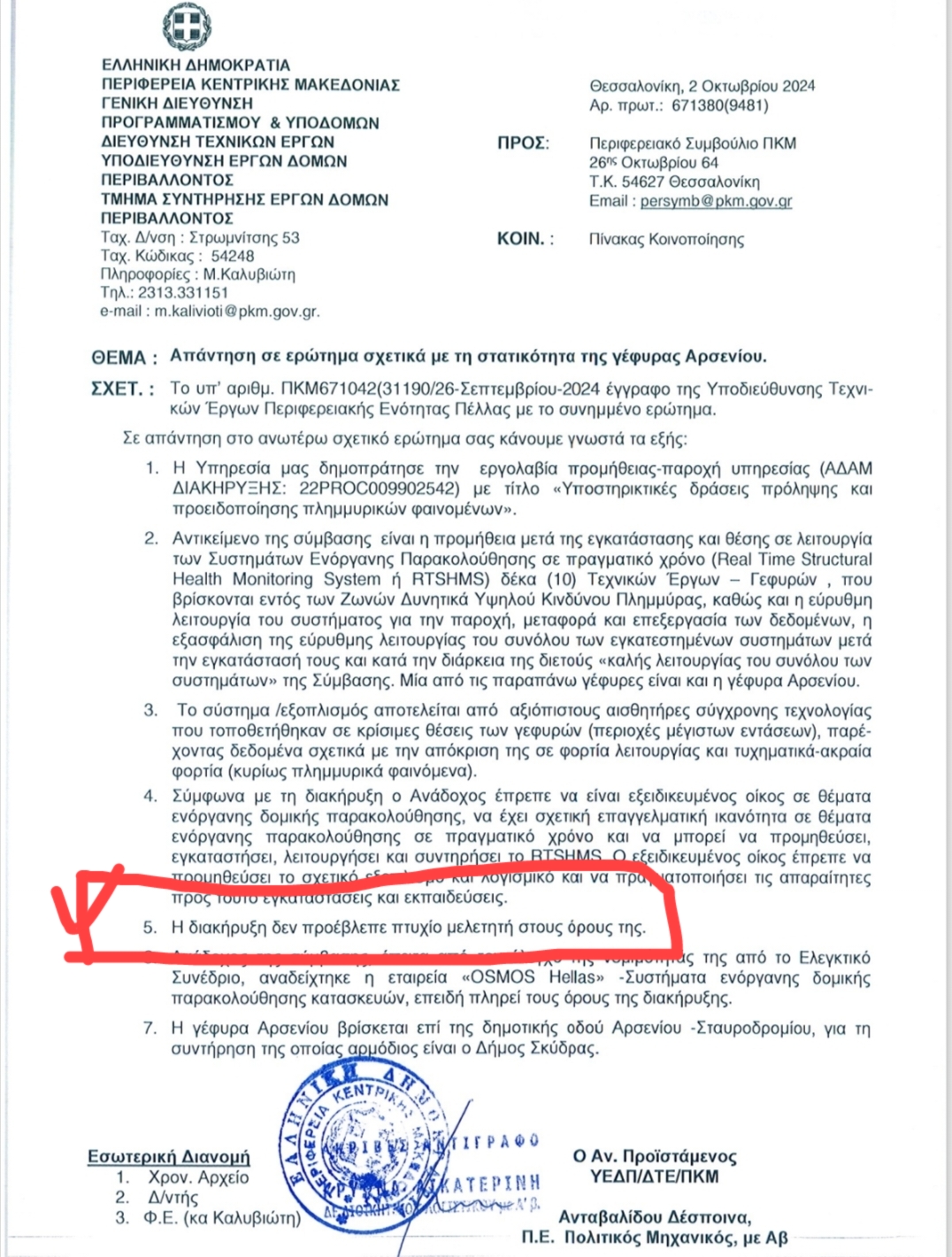 Μεγάλα ερωτήματα εγείρει η απάντηση της Περιφέρειας Κεντρικής Μακεδονίας σχετικά με τη στατικότητα της γέφυρας Αρσενίου. Όπως προκύπτει ξεκάθαρα από το επίσημο έγγραφο της Διεύθυνσης Τεχνικών Έργων, η σχετική διακήρυξη για την παρακολούθηση και έλεγχο της γέφυρας δεν προέβλεπε πτυχίο μελετητή στους όρους της.