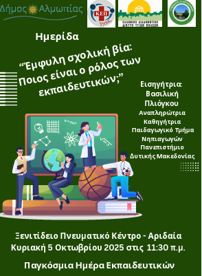 Με αφορμή την Παγκόσμια Ημέρα Εκπαιδευτικών, ο Δήμος Αλμωπίας, το ΚΕΠ Υγείας Δήμου Αλμωπίας σε συνεργασία με το Γυμνάσιο Εξαπλατάνου σας προσκαλούν στην ημερίδα "ΕΜΦΥΛΗ ΣΧΟΛΙΚΗ ΒΙΑ: