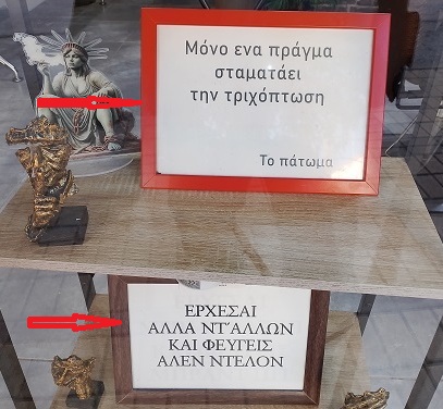 Τις παρακάτω έξυπνες και πρωτότυπες πινακίδες, τις αλιεύσαμε από την προθήκη ενός κουρείου στην πόλη των Γιαννιτσών και επί της οδού Χατζηδημητρίου.