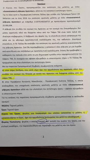 Β) Στην Περιφέρεια Κεντρικής Μακεδονίας-π.ε. Πέλλας η οποία αναλαμβάνει την υποχρέωση εκπόνησης οριστικής μελέτης με τίτλο "Ανακατασκευή γέφυρας Αρσενίου" αλλά και την υλοποίηση αντίστοιχου έργου – εφόσον εξευρεθούν οι απαραίτητοι πόροι κλπ κλπ.